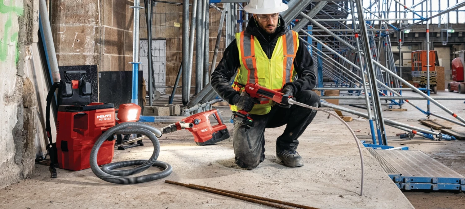 Conçu pour la mobilité – une forme compacte, de grandes poignées et un poids de seulement 6 kg en font l’aspirateur de chantier le plus maniable de Hilti à ce jour