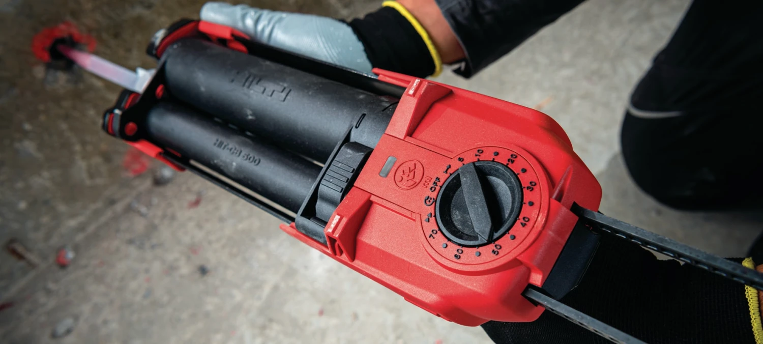 Injection de résine chimique ou époxy HIT Hilti pour la fixation de tiges d’ancrage et de fers d’armature dans le béton et la maçonnerie