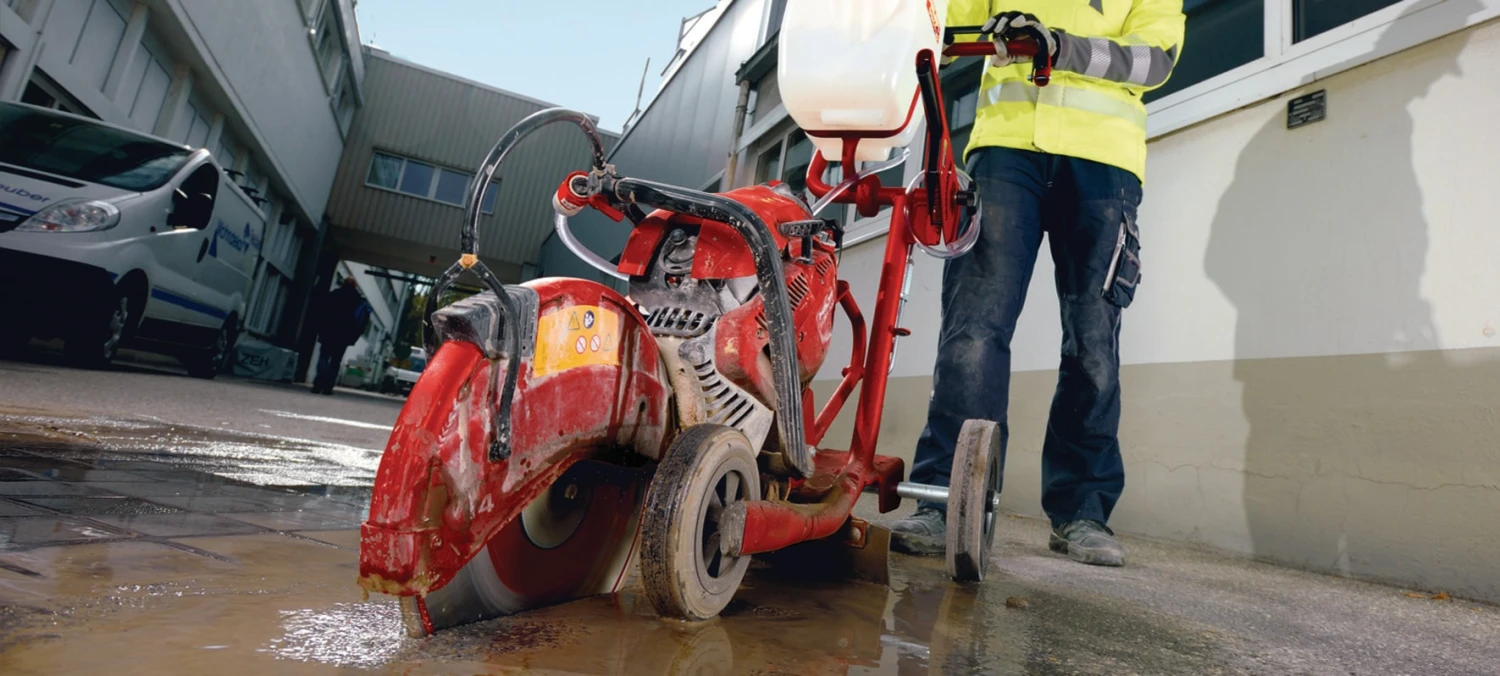 Puissante tronçonneuse thermique 400 mm, conçue pour faciliter et accélérer vos travaux de découpe les plus exigeants – même le sciage au sol à l’aide du chariot de scie à sol DSH-FSC en option